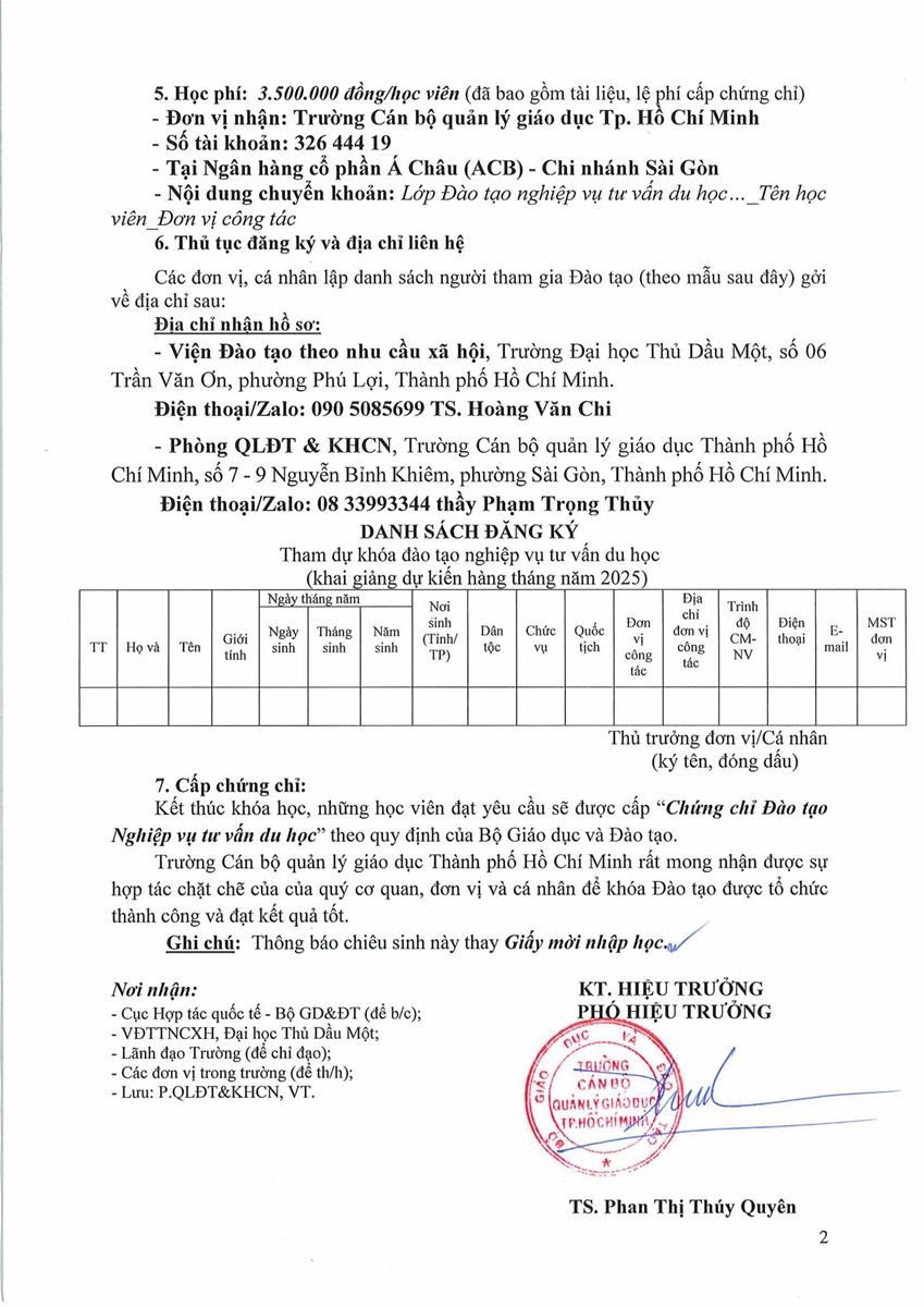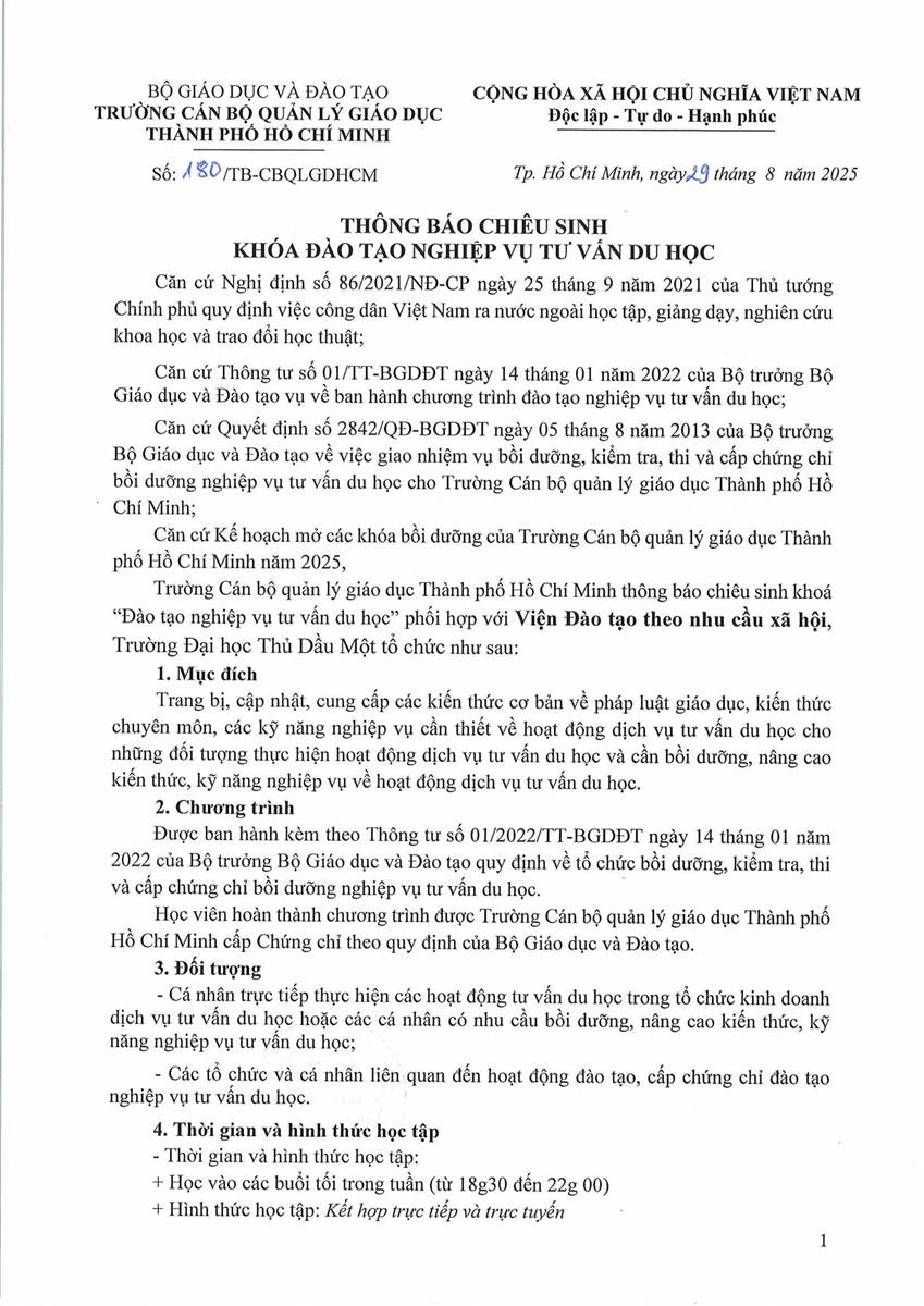 THÔNG BÁO CHIÊU SINH KHÓA ĐÀO TẠO NGHIỆP VỤ TƯ VẤN DU HỌC
